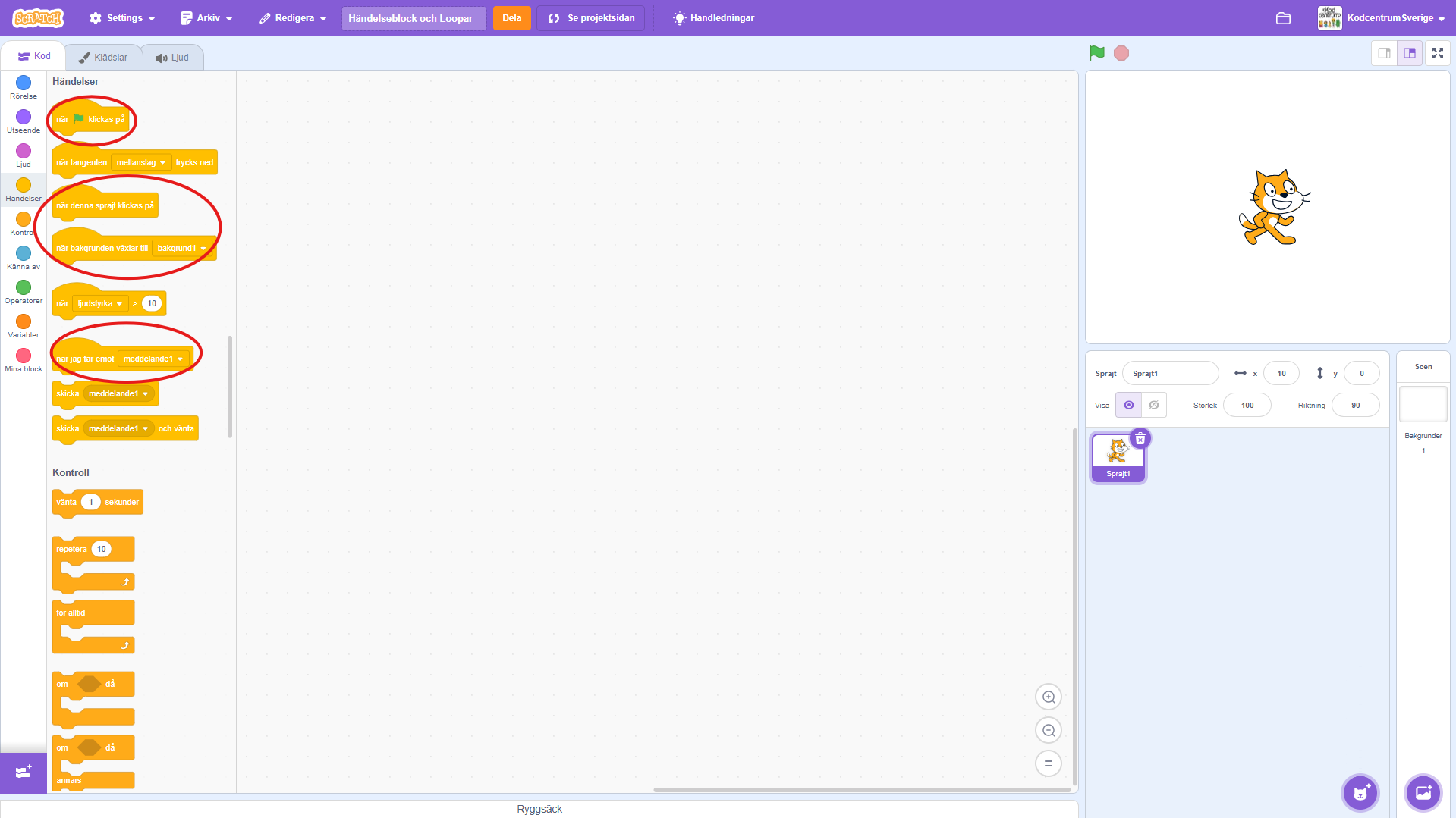 Klicka på de gula händelseblocken för att hitta startblocken. Startblock behövs för att din kod ska kunna köras. Det vanligaste startblocket är “när grön flagga klickas på” som gör att koden körs varje gång den gröna flaggan klickas på.