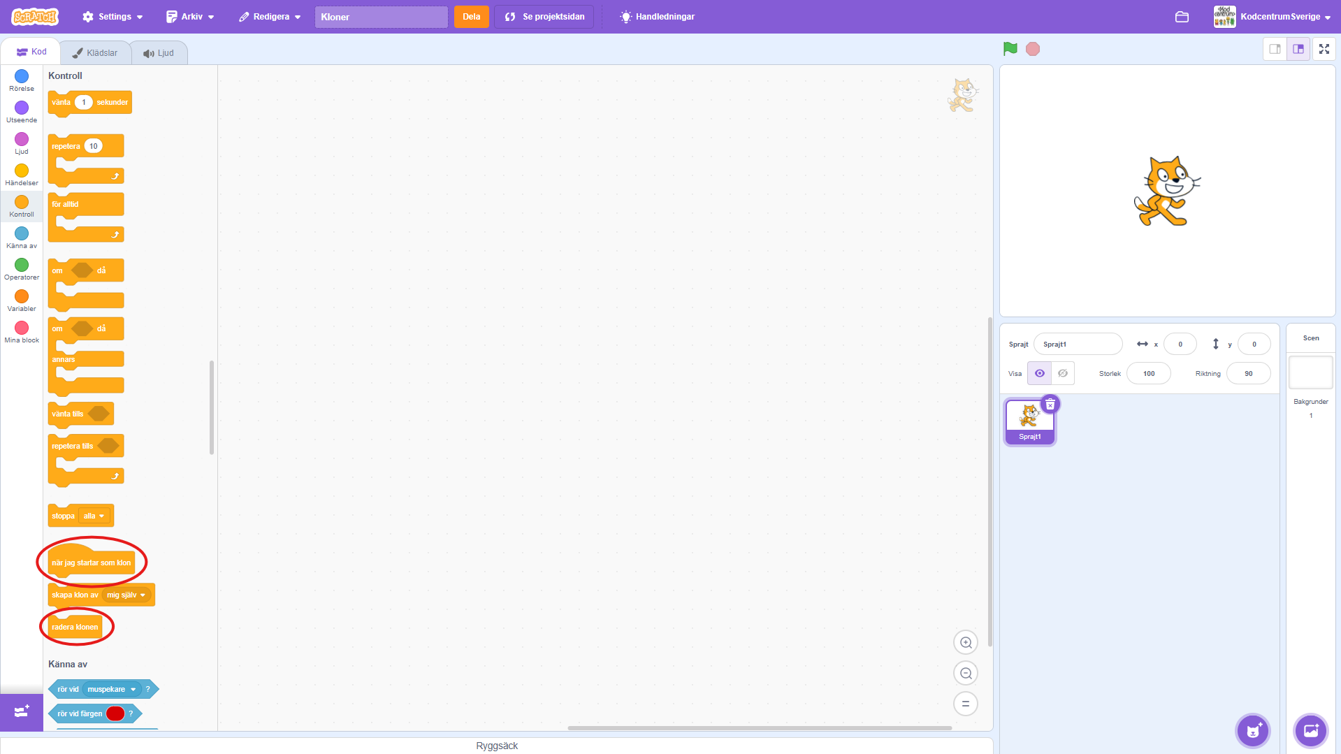 Klicka på de orangea kontrollblocken för att hitta startblocket "när jag startar som klon". Allting du vill att klonerna ska göra ska programmeras under detta block. Original-sprajten kommer inte att utföra det som klonerna programmeras att göra.