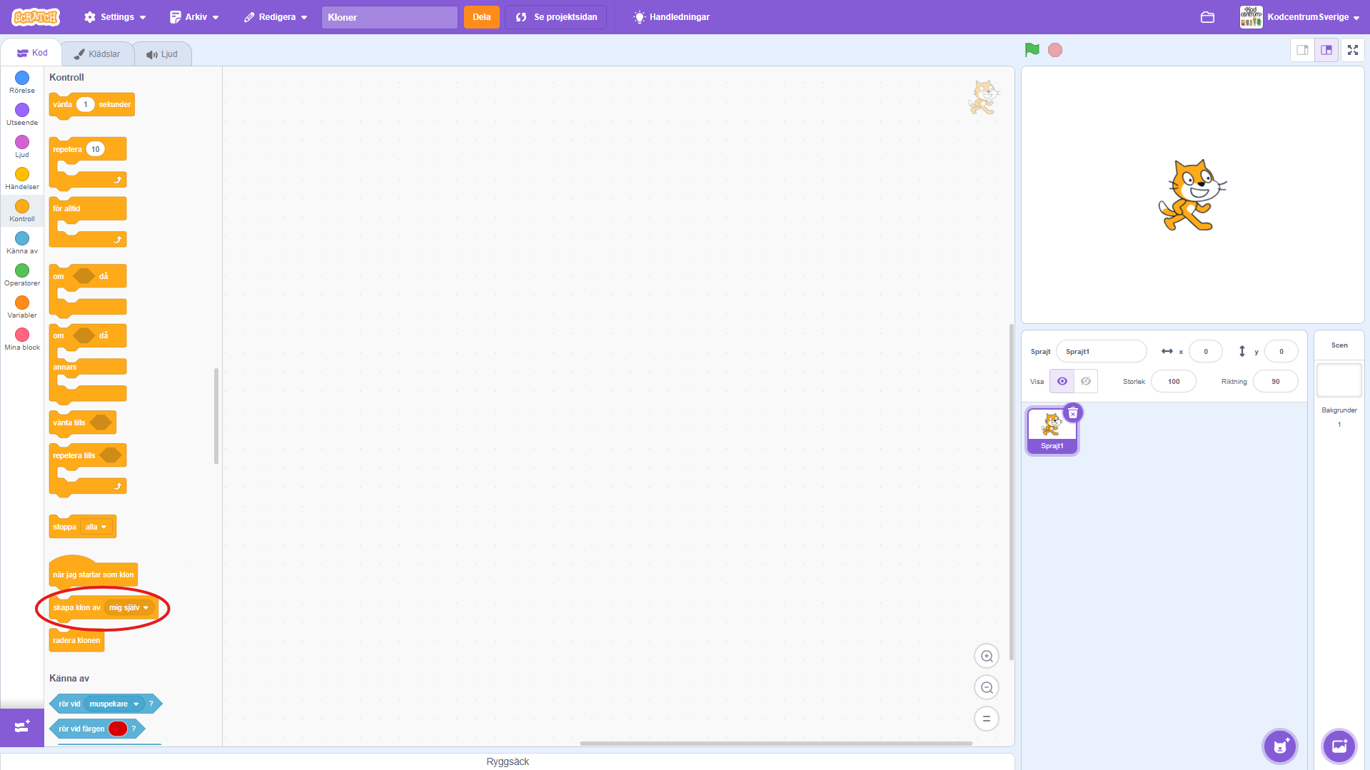 Klicka på de orangea kontrollblocken för att hitta “skapa klon av mig själv” blocket. Blocket används för att skapa kloner av den Sprajt du programmerar.