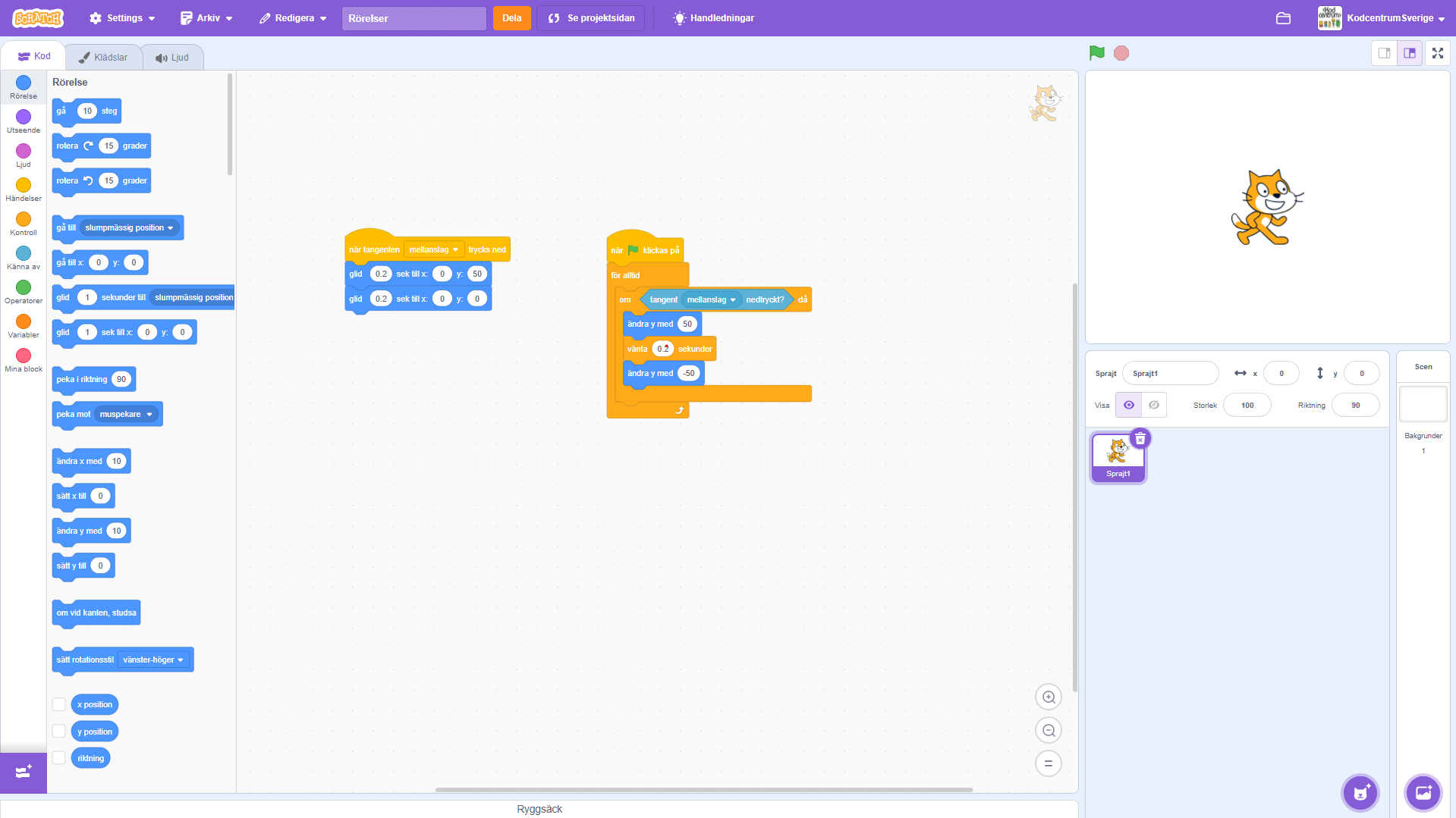 Du kan också hoppa genom att använda "glid 1 sekund till x:.. y:…" istället för "ändra y med 10" och experimentera med tiden så att det fungerar som du vill!