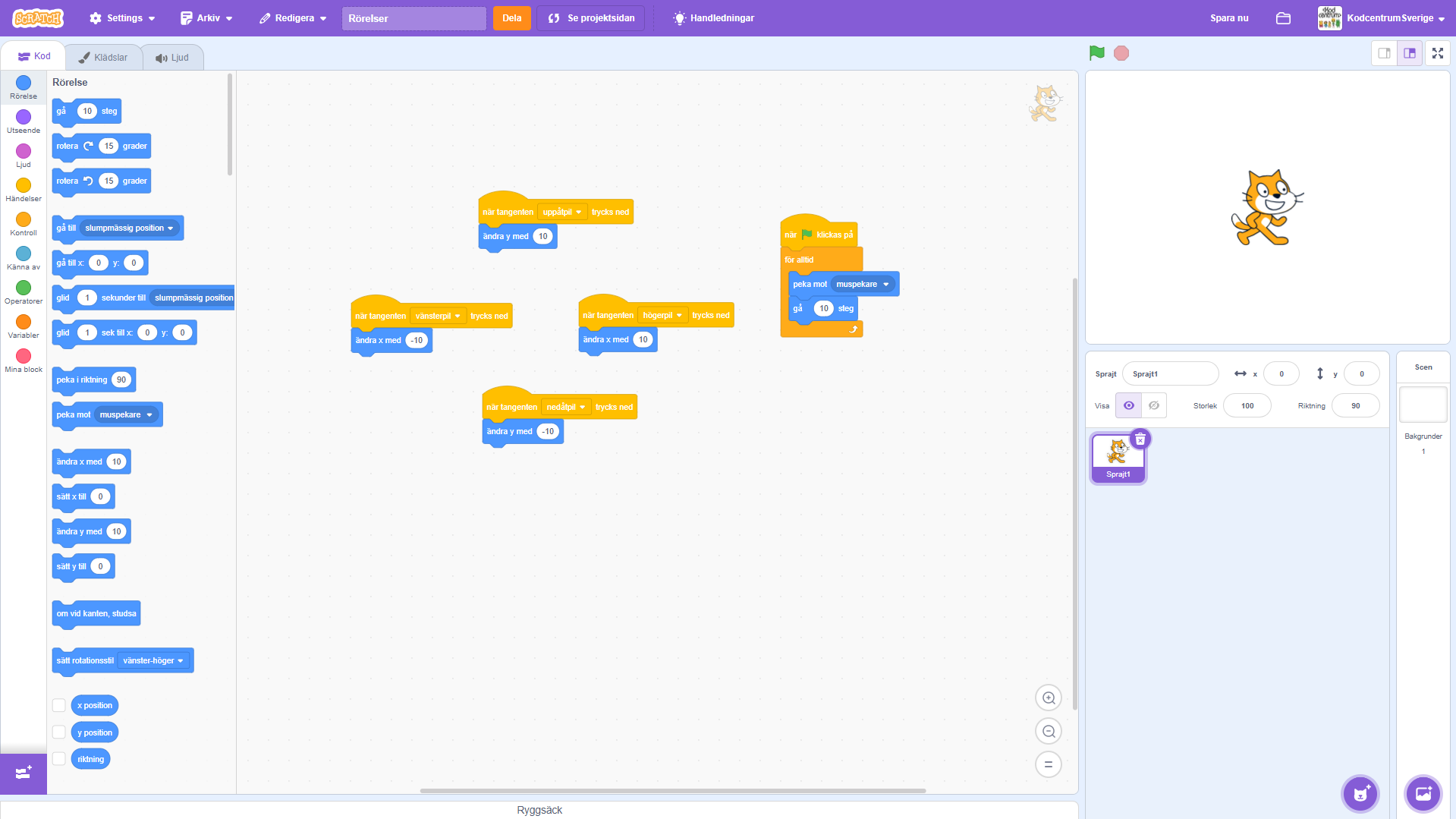 Du kan använda dig av det gula händelseblocket “när tangenten … trycks ned” för att antingen ändra riktning eller position med hjälp av rörelseblocken du lärt dig om.