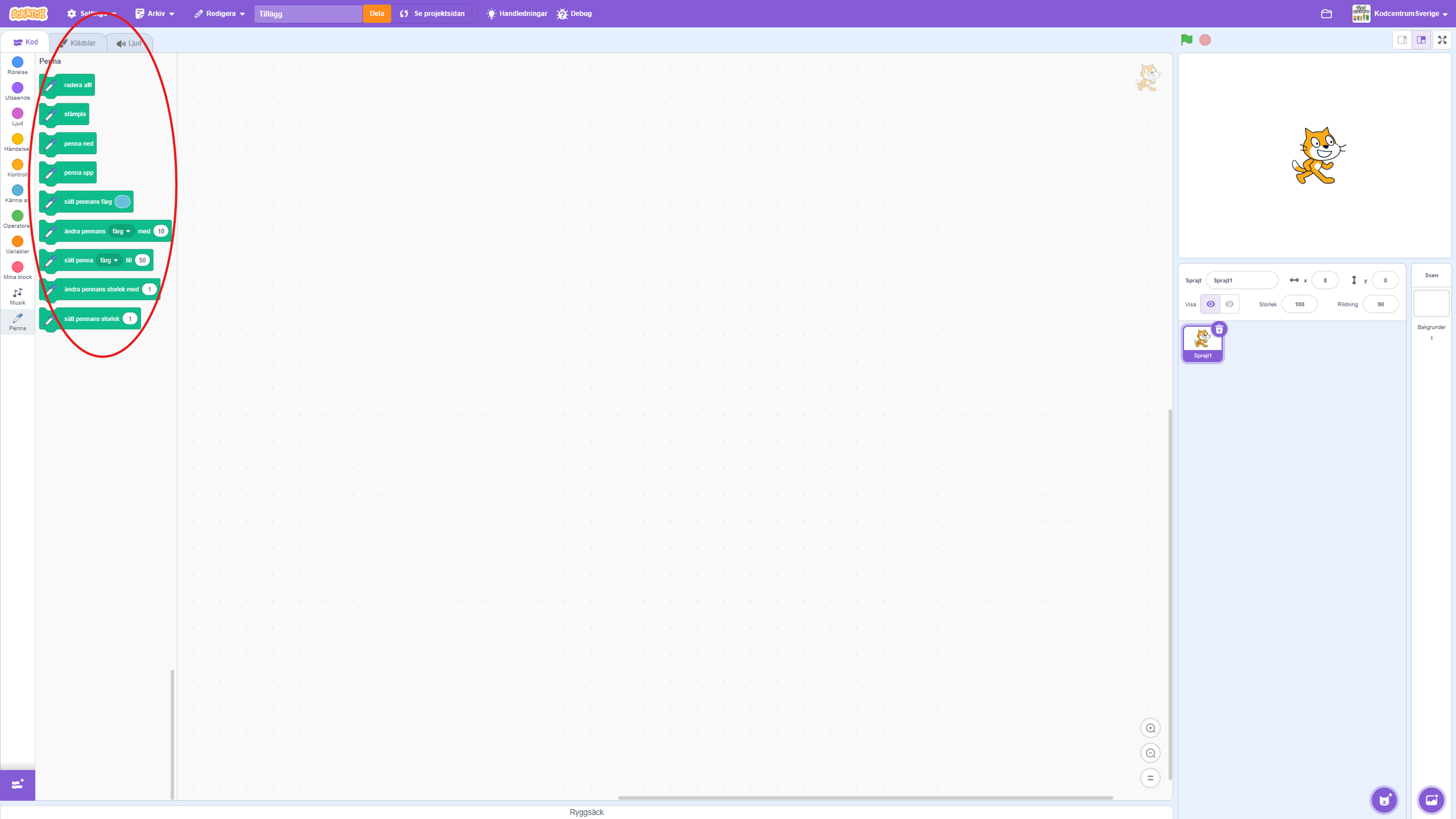 “Penna ned” gör att pennan sätts ned på scenen, sprajten börjar rita.